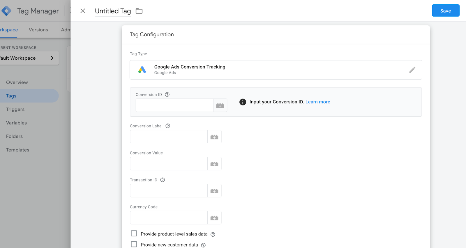 4. Enter your Conversion ID (e.g., AW-123456789). For Conversion Tracking, also enter the Conversion Label.